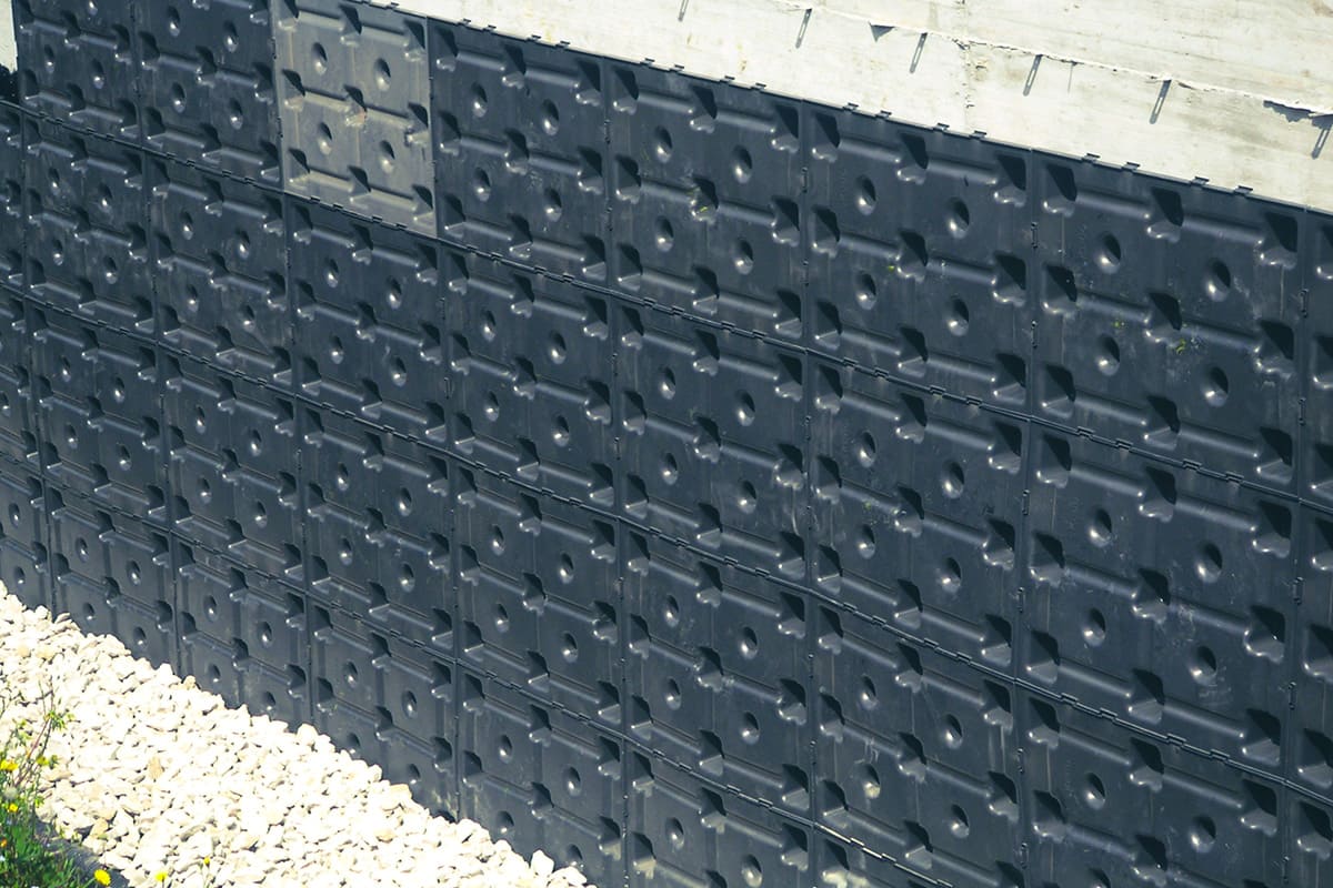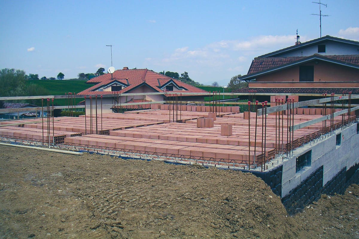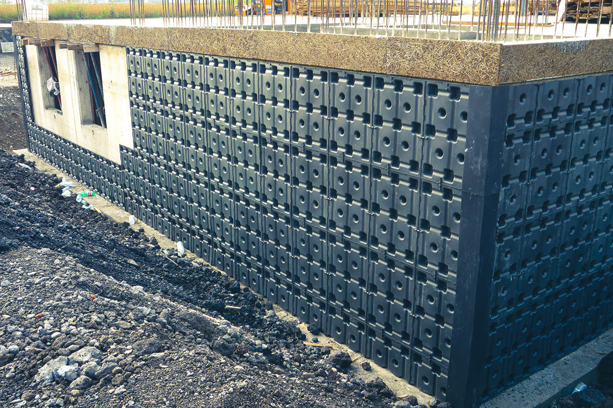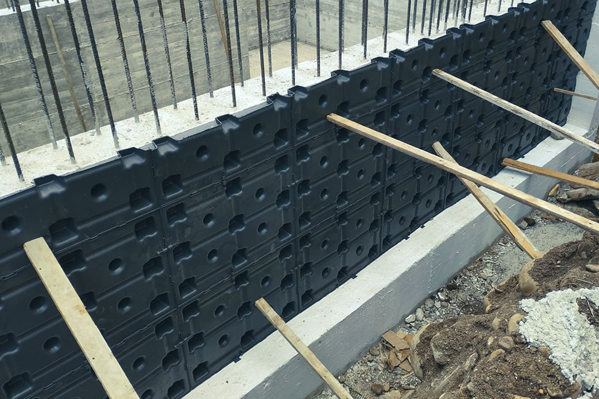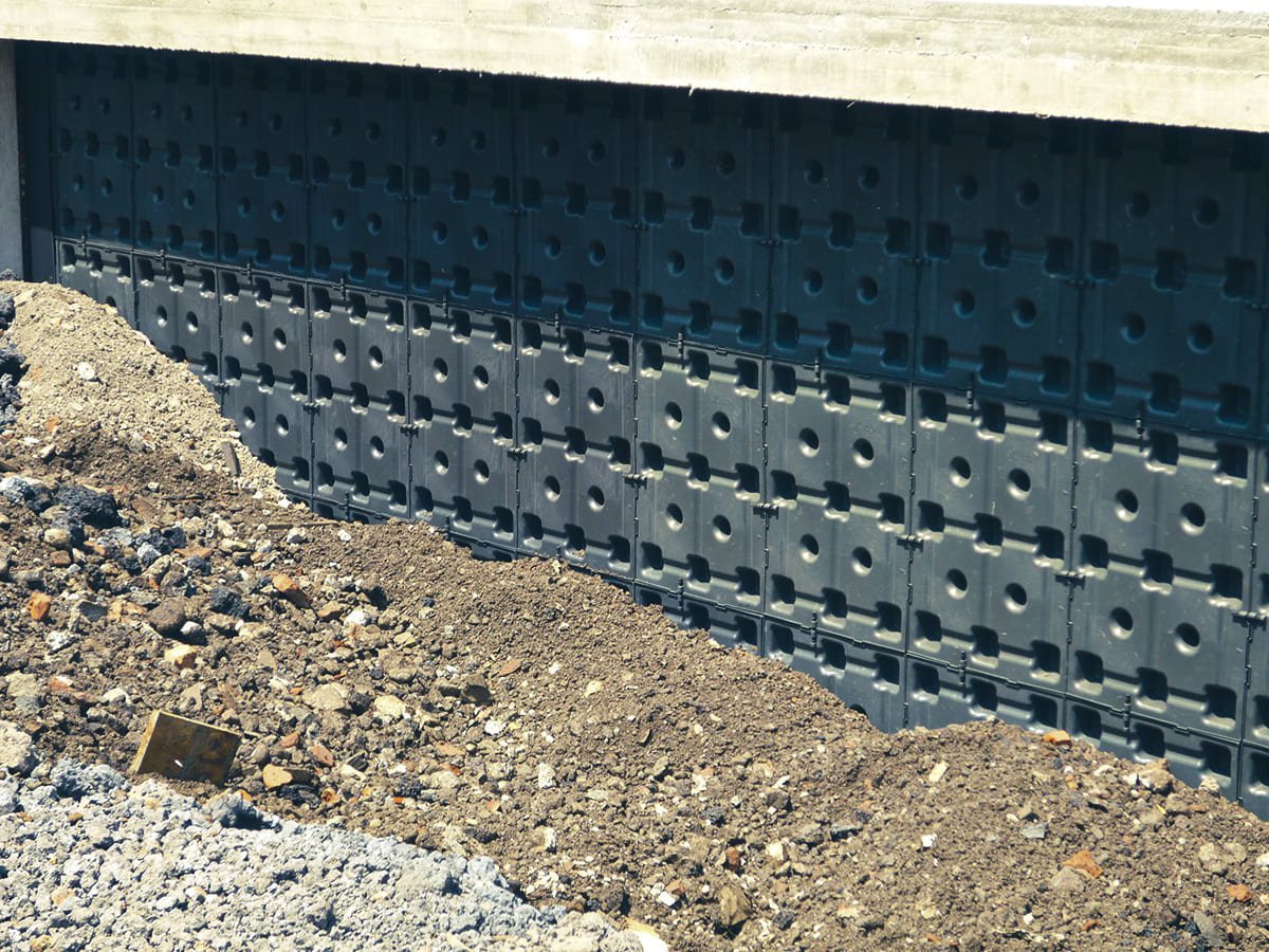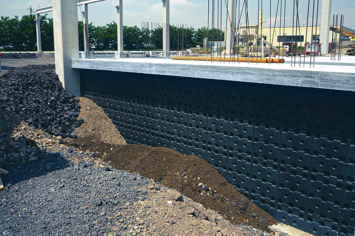 Su altura crea una óptima cámara de aire para la ventilación y una excelente separación de la humedad del suelo. Se recomienda la creación de un canal en la base del muro para recolectar el agua drenada, sobre el cual se colocará Skudo.
