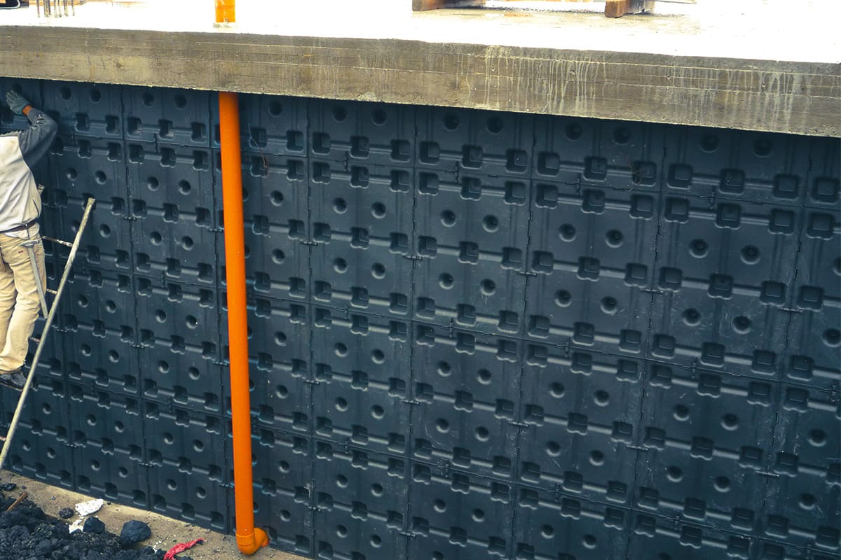 Realización de la protección de la impermeabilización y el aislamiento de estructuras verticales en contacto con el suelo mediante el suministro e instalación de elementos tipo Skudo de plástico reciclado, resistente a sustancias químicas y orgánicas, con dimensiones de 59 cm x 59 cm y una altura de 7,5 cm. Le bases de apoyo formarán una superficie de contacto de 755 cm2/m2, evitando daños en la capa impermeable. La cámara de ventilación de 65 l/m2 se generará gracias a la forma troncocónica de los apoyos, garantizando una resistencia a la compresión de al menos 5000 kg/m2, preservando y separando la capa impermeable de la humedad del suelo. La estabilidad térmica del elemento oscilará entre -21° C y +53° C.