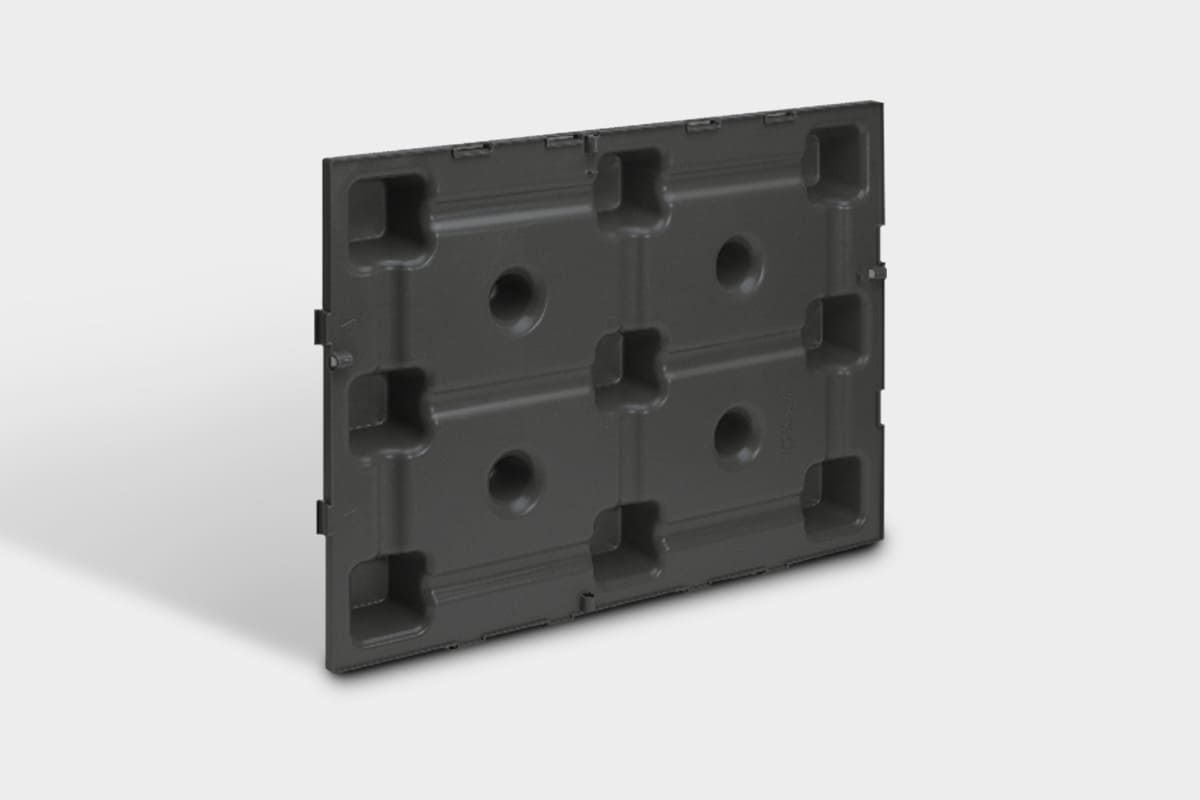 El espesor del elemento de 7,5 cm, combinado con su forma especial compuesta por troncos de cono y pirámide, crea una cámara de aire de 65 l/m2. Este volumen de aire garantiza una excelente ventilación y, al mismo tiempo, separa la humedad del suelo, eliminando así la necesidad de grava.