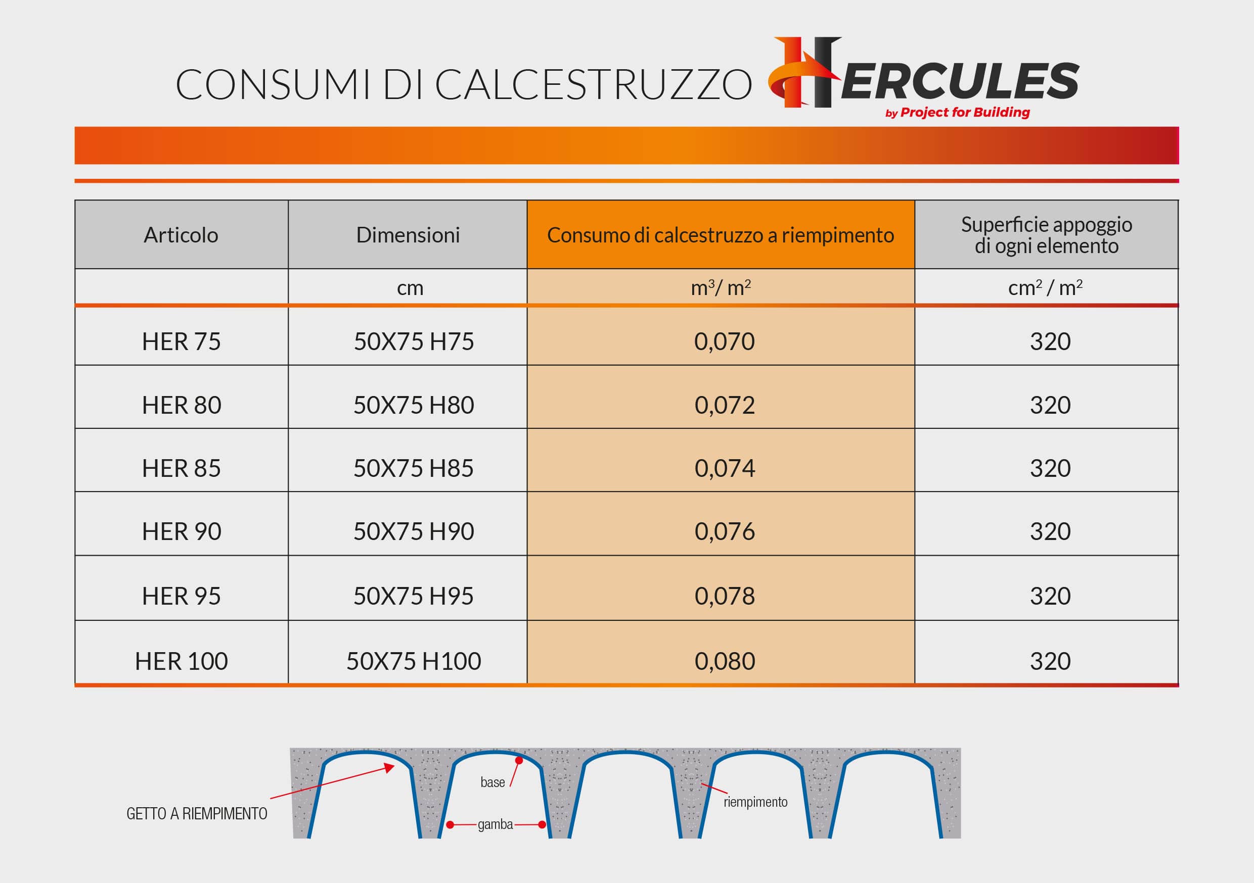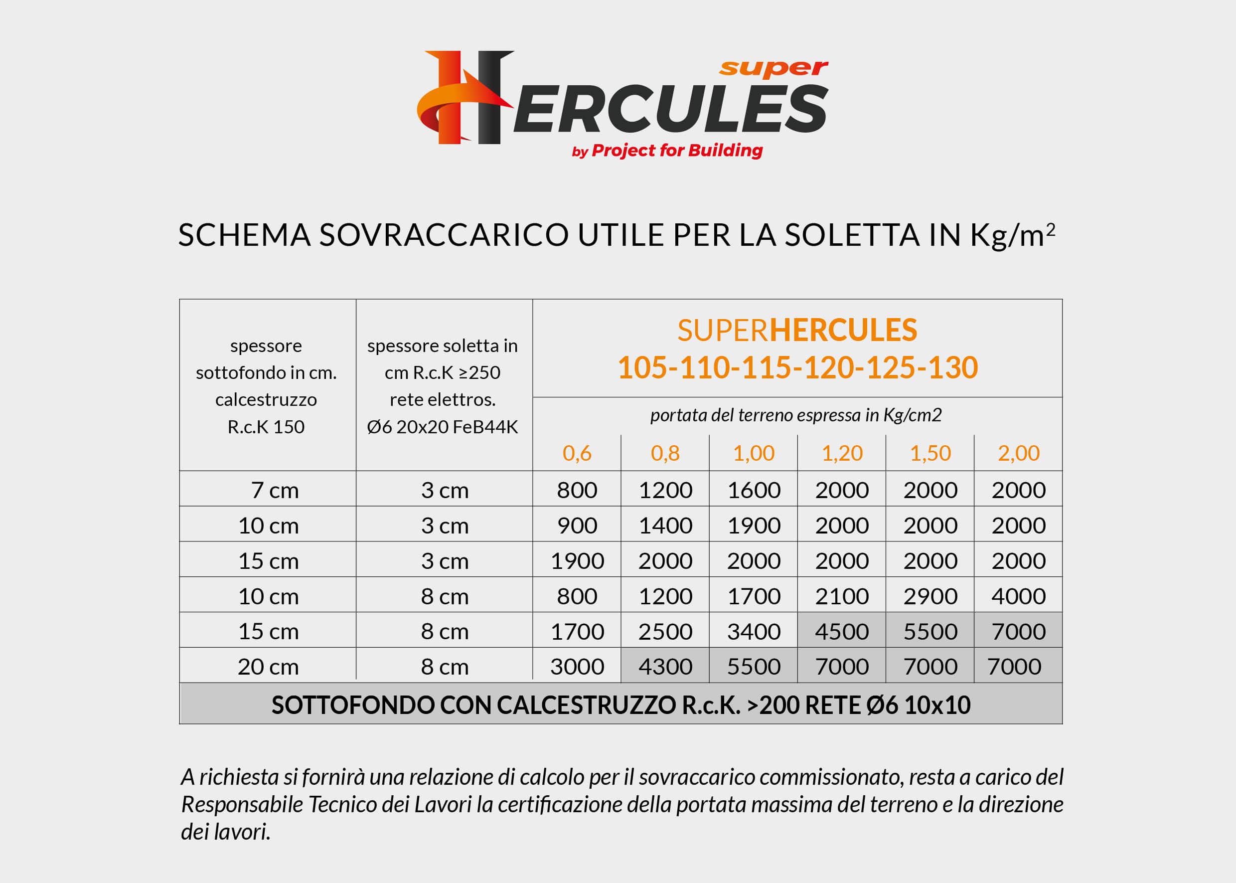 HERCULES, essendo cassero a perdere, è stato progettato per sopportare il peso degli operatori e del calcestruzzo durante la fase di getto. Il sovraccarico utile varia in funzione dello spessore della soletta e del magro sottostante.