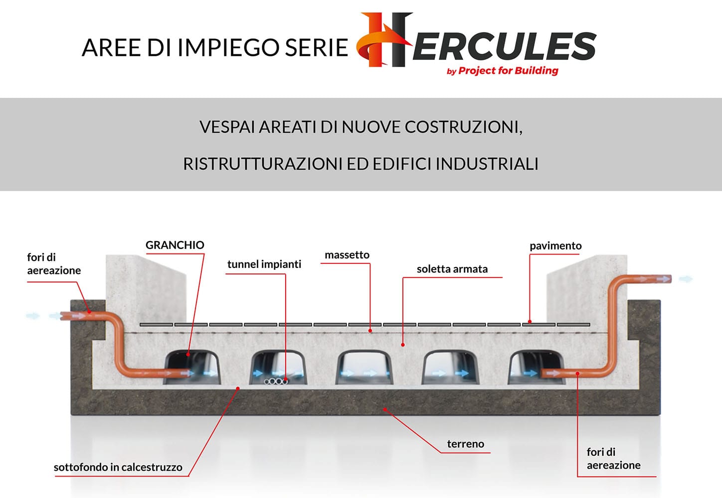 Hercules raggiunge un’altezza di 130 cm, lasciando ampio spazio per il passaggio di tutti gli impianti. Grazie ai tubi d’areazione che convogliano verso l’esterno, si assicura la dispersione in atmosfera del gas Radon e dell’umidità da risalita, trovandosi in accordo con la raccomandazione della Commissione della Comunità Europea del 21/02/90.